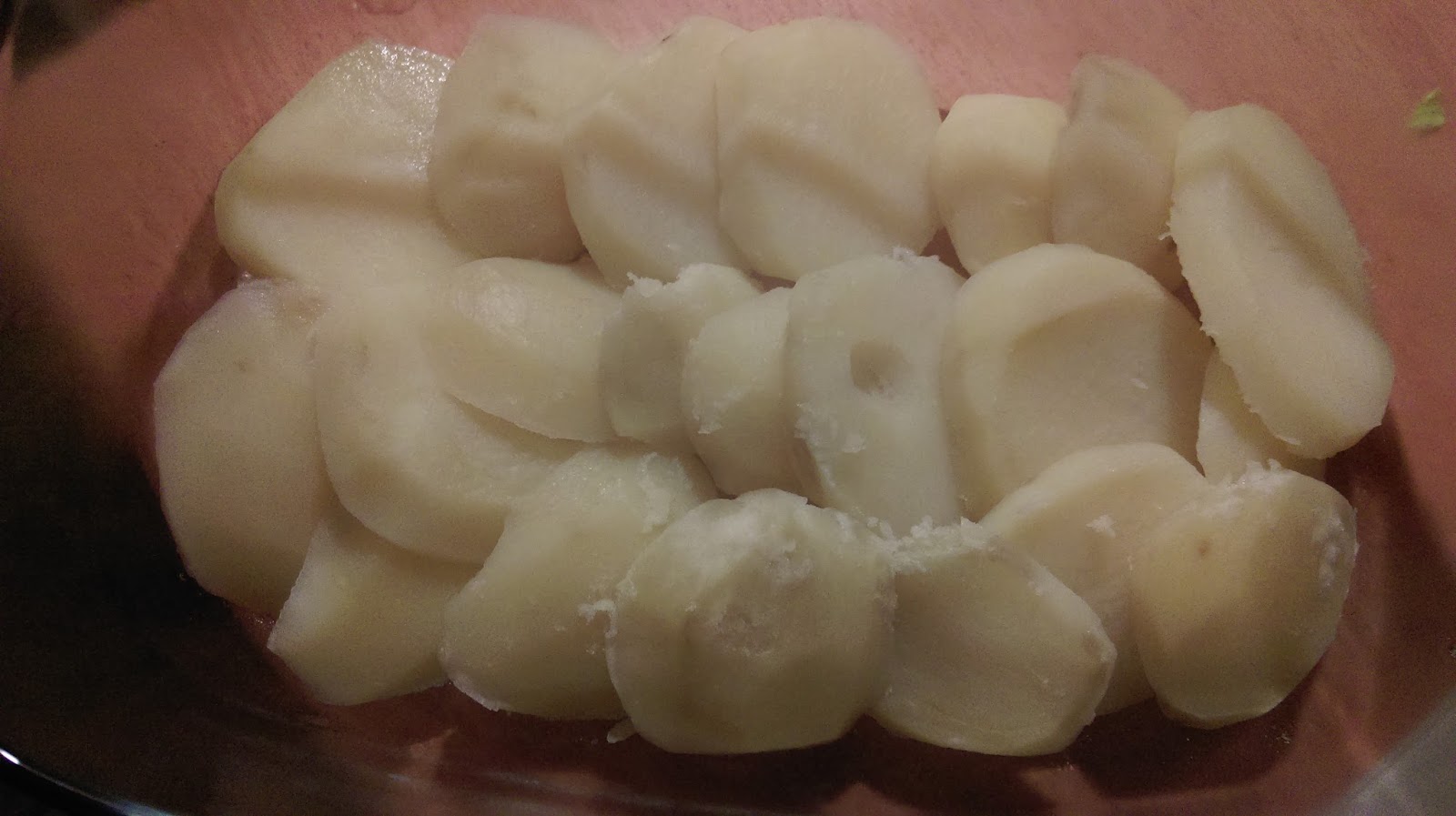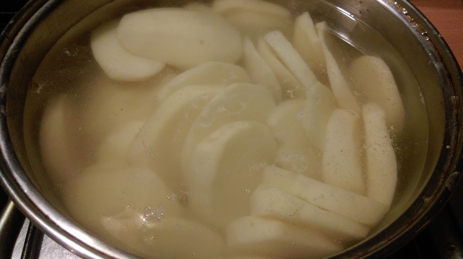 Ziemniaki obieramy, kroimy w dość grube plastry i gotujemy w lekko osolonej wodzie, ale tak, by pozostały jeszcze lekko twarde, wystarczy kilka minut od momentu zagotowania.