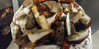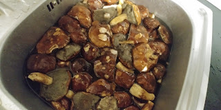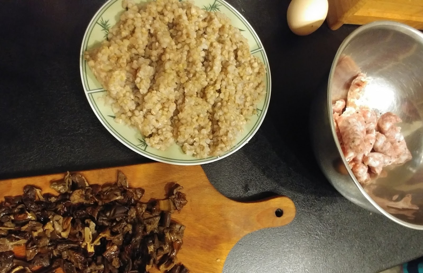 Odstawiamy na minimum 2 h do zamarynowania, w chłodne miejsce/do lodówki. Gotujemy kaszę. Grzyby namaczamy, odlewamy wodę i w świeżej gotujemy jakieś 15 minut. Studzimy i kroimy je, nie za bardzo drobno. Kiełbaski wyjmujemy z osłonek.