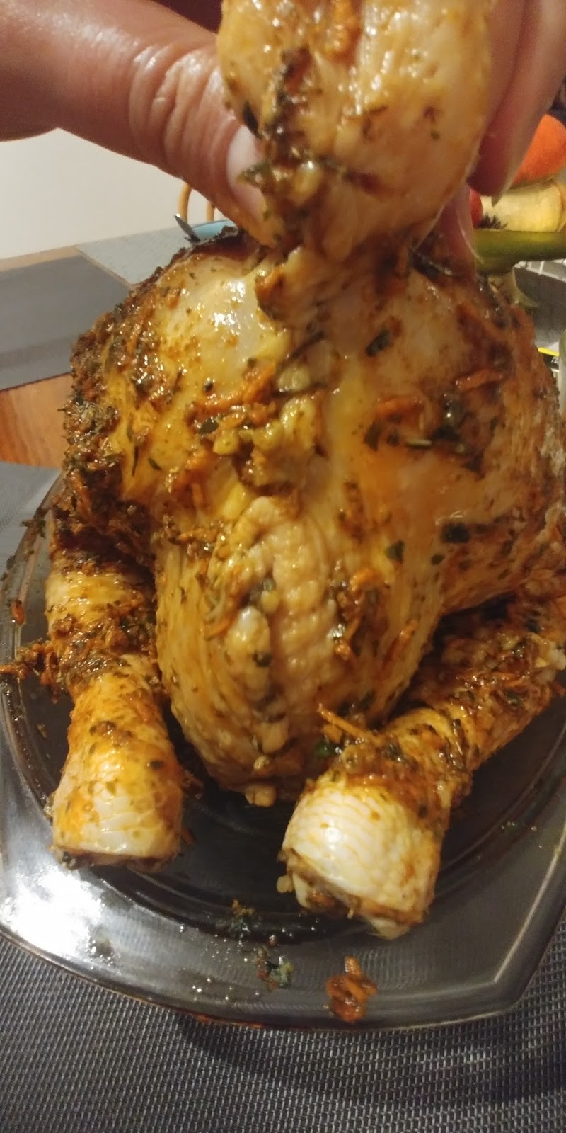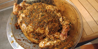 Dobrze aby wraz z kurczakiem do naczynia trafił także tłuszcz z marynaty i nieco wody, ok 1/4 szklanki. Wstawiamy do piekarnika nagrzanego do 220 stopni. Po 15 minutach zmniejszamy temperaturę do 180 stopni i pieczemy dalej pod przykryciem przez godzinę. Następnie odkrywamy, polewamy pieczonkę 1/2 szklanki wody. Pieczemy dalej przez 45 minut, polewając kurczaka co jakiś czas powstałym na dnie naczynia sosem. Przed porcjowaniem dobrze jeśli odstawimy kurczaka na kilka minut.