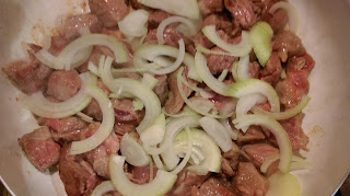 Gdy już będzie zrumienione dodajemy pokrojoną w pióra cebulę.