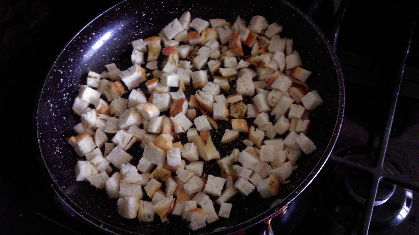 Dokładamy do sałatki, tak jak i pokrojonego kurczaka. Na koniec w kostkę kroimy bagietkę i na suchej, średnio rozgrzanej patelni “suszymy” pieczywo aż stanie się chrupiące.