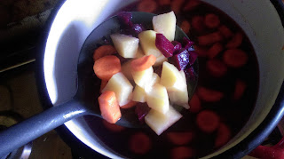 Myślę, że 30 minut spokojnie wystarczy. W międzyczasie obieramy buraczki, ziemniaki, i dwie pozostałe marchewki. Ziemniaki kroimy w standardową kostkę do zupy, buraczki w nieco mniejsza, marchewki w plasterki- jeśli będą za duże, to pokrójmy je jeszcze na pół.