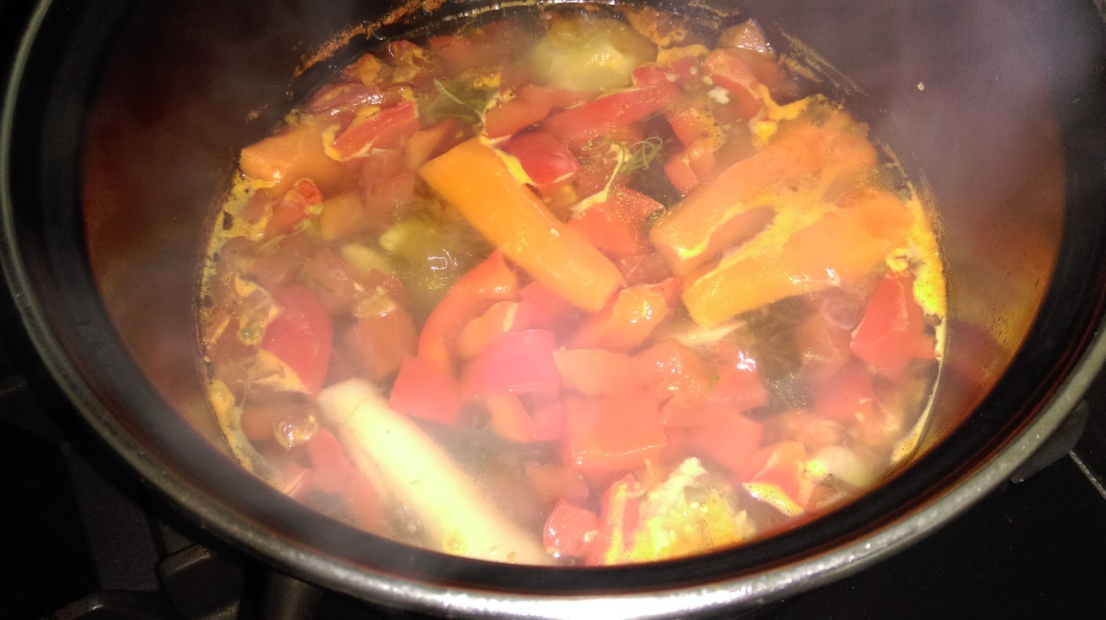 Bulion, którego użyłam, gotowałam na świeżo, specjalnie do tej zupy. Składniki tradycyjne- trochę mięsa, dużo warzyw, przypraw. Gdy wywar był już gotowy, czyli wszystkie składniki zmiękły i oddały płynowi swój smaku, przecedziłam go, pozostawiając w środku jedynie kawałek selera, marchewkę, małą pietruszkę i cebulę- po zmiksowaniu dodały zupie nieco gęstości. Nie chciałam jednak by była przesadnie gęsta, niczym zupa-krem, dlatego nie wykorzystałam wszystkich warzyw. Do około 3 litrów delikatnie gotującego się płynu dorzuciłam dużego pomidora oraz dwie duże, świeże, czerwone papryki, a to wszystko pokrojone w dość drobną kostkę. Jest to ważne, gdyż nie obierałam warzyw ze skórek. Z dużych kawałków mogłaby się nam ona zbytnio ciągnąć po zupie pomimo miksowania. Wszystko pichciło się w ten sposób jakieś 15 minut, a w tym czasie przygotowałam pulpety.