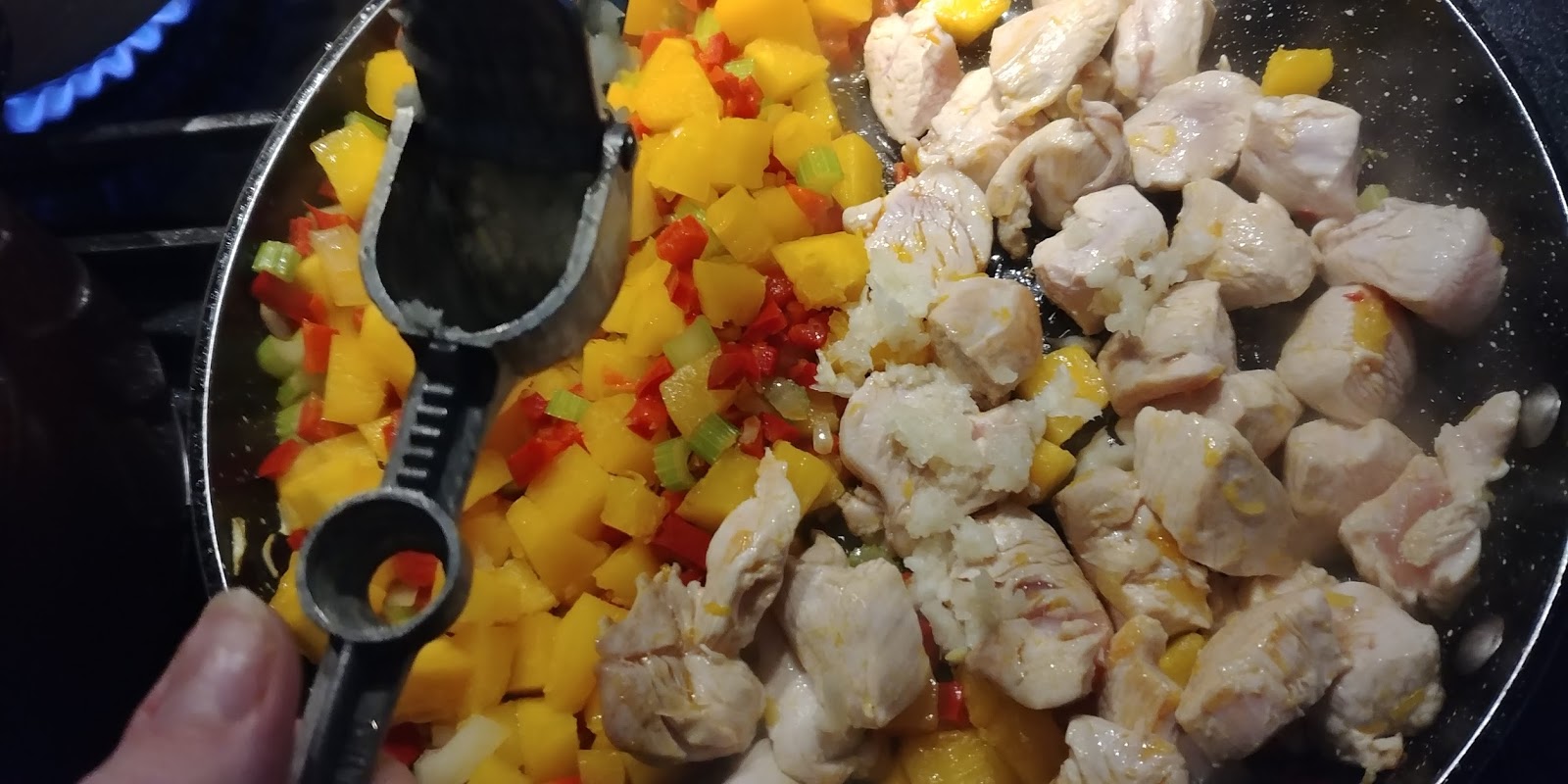 Jeśli macie małą patelnie podsmażcie mięso na osobnej- krótko na sporym ogniu i dodajcie do warzyw. Przez praskę przeciskamy czosnek- dodajemy.