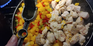 Oczyszczamy mięso i także kroimy w kostkę/nieduże paski. Przesuwamy warzywa na bok patelni i podsmażamy mięso.