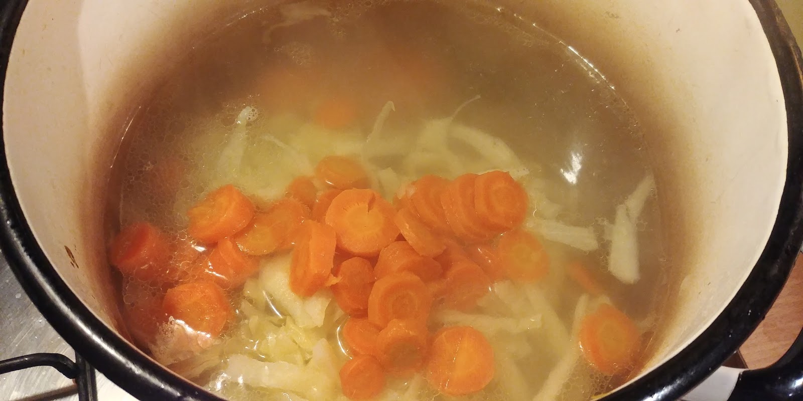 Mięso i marchewki będą nam jeszcze potrzebne, więc oczywiście nie wyrzucajcie! (Resztę warzyw można pokroić i zrobić oszukaną jarzynową 😉 ). Do wywaru wrzucamy kapustę i pokrojone w plastry podgotowane marchewki.