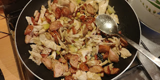 Następnie dodajemy kiełbasę, salami. Jeśli to konieczne- dodajemy kilka łyżek tłuszczu, najlepiej neutralnej w smaku oliwy.
