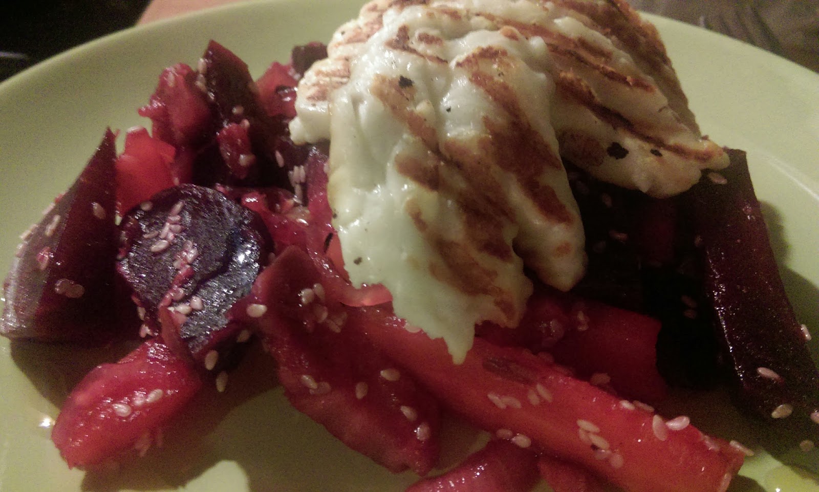 Na patelnię wrzuciłam pokrojone warzywa, doprawiłam sporą ilością pieprzu i jeszcze odrobiną soli do smaku. Podgrzewałam całość przez kilka minut mieszając, by warzywa dobrze pokryły się maślano-miodową glazurą i sezamem. W międzyczasie na patelni grillowej podsmażyłam pokrojony w plastry ser. Wszystko razem smakuje nieziemsko! Cudownie słodkie i sezamowe warzywa z dodatkiem słonego, lekko przypieczonego