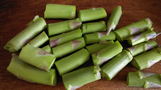 Szparagi myjemy, czyścimy, odcinamy dolną zdrewniałą część, którą dorzucamy do gotującego się bulionu.