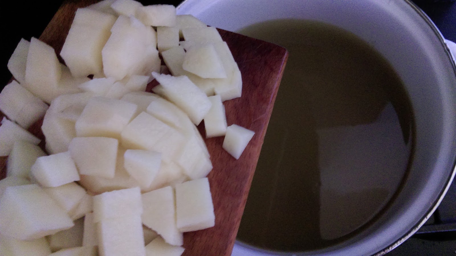 Bulion przecedzamy, do gotującego się wywaru wrzucamy pokrojone w kostkę ziemniaki.