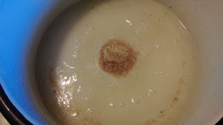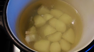 Po ugotowaniu wyciągamy wszystkie składniki i pozostawiamy w garnku czysty bulion. Ziemniaki kroimy w kostkę i wrzucamy do bulionu.