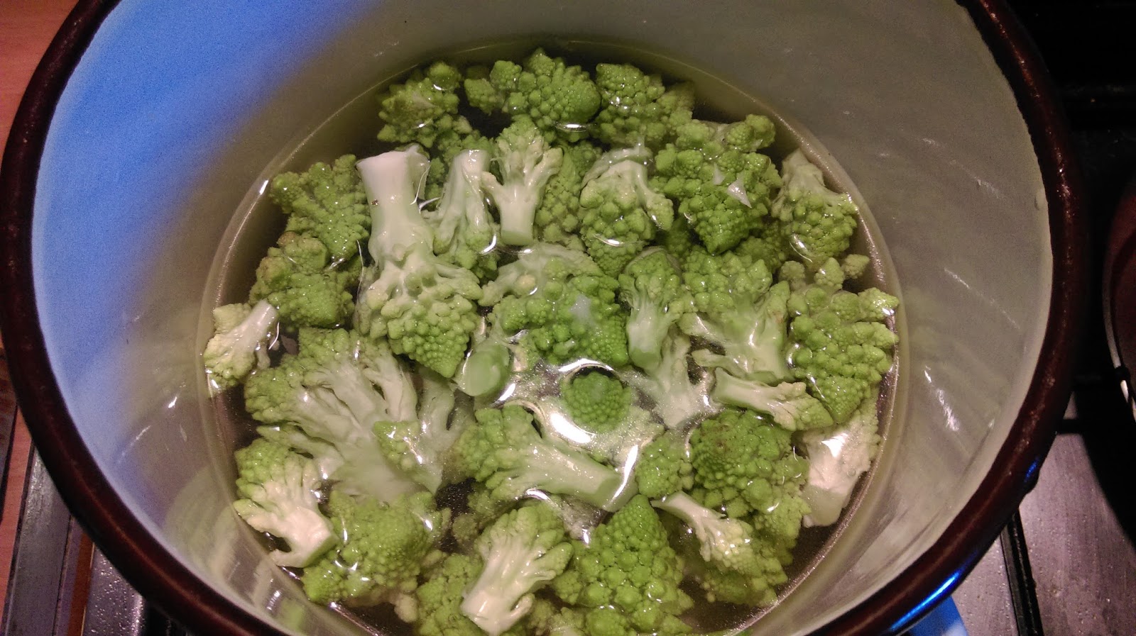 W międzyczasie przygotowujemy pozostałe kalafiory. Dzielimy na różyczki i gotujemy zielonego kalafiora, w lekko osolonej wodzie, nie za długo.