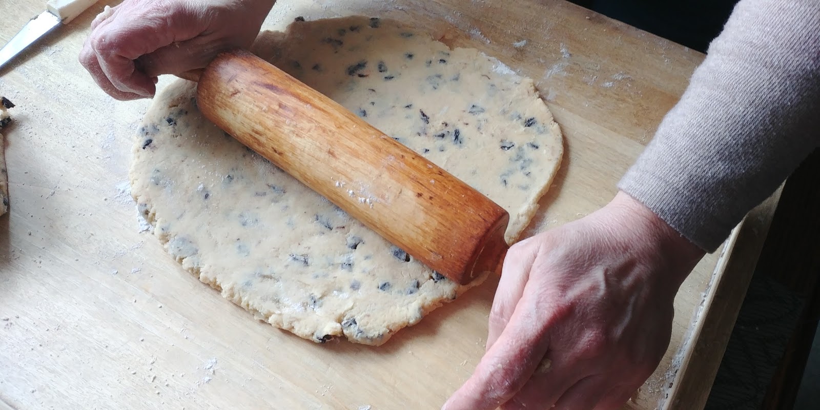 1/2 (może troszeczkę więcej) ciasta rozwałkowujemy na placek o grubości mniej więcej 0,5 cm, w razie potrzeby podsypując mąką.