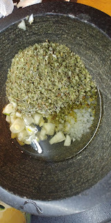 Przekładamy do moździerza. Dosypujemy gruboziarnistą sól, majeranek i ziarna pieprzu. Dolewamy olej i ucieramy na pastę.