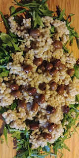 Dodajemy kaszę. Mieszamy z oliwkami, pokrojonymi w plastry, lub jeśli są małe- pozostawionymi w całości.